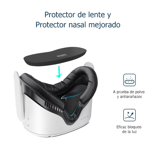 El set también incluye un soporte de interfaz facial con protector nasal. Este soporte está diseñado para mantener los lentes en su lugar de manera segura durante el juego intenso. El protector nasal actualizado proporciona una protección adicional al evitar que la luz externa se filtre en los lentes, lo que te permite sumergirte por completo en el mundo virtual sin distracciones. Además, el soporte de cubierta facial está construido con materiales de alta calidad que garantizan su durabilidad a largo plazo.