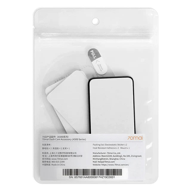 Included parts include two electrostatic stickers, two heat-resistant adhesives, and a dash cam mount. Each 70mai camera accessory is crucial for the camera's proper functioning and is easily replaceable if damaged or worn.