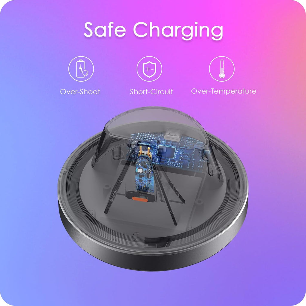 • Stable Base with LED Indicator: The weighted, circular base with reusable adhesive stays firmly on any surface. The LED lights up orange while charging and turns green when fully charged, providing a clear status at a glance.