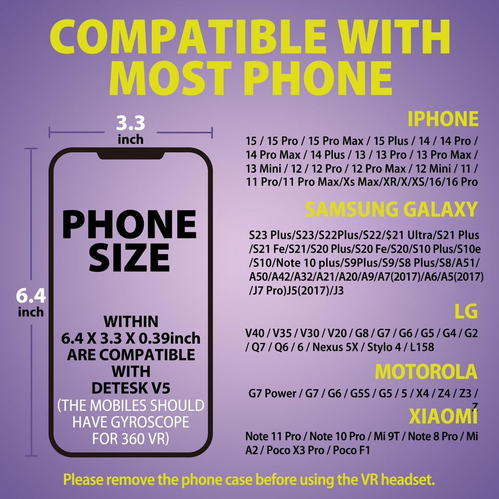 - Retire la funda del teléfono antes de usar el casco de realidad virtual. MODELOS DE TELÉFONOS COMPATIBLES: las gafas DESTEK V5 VR admiten teléfonos con un SENSOR GIROSCOPIO (TELÉFONO DE 6.4*3.3*0.39 pulgadas L*W*H), como para iPhone 16/16 Pro/iPhone 15/15 Pro/15 Plus/14/14 Pro/14 Pro Max/14 Plus/13/13 Pro/13 Pro Max/13 Mini/12/12 Pro/12 Pro Max/12 Mini/11/11 Pro/11 Pro Max/Xs Max/XR/X/Xs, para Samsung s23 plus/s23/s22 plus/s22/s21 plus/s21 fe/s21/s21 Ultra/s20 plus/s20 fe/s20/S10 Plus/S10e/s10/note 20/note 10 plus/s9plus/s9/s8 plus/s8/A51/A50/A42/A32/A21/A20/A9/A7(2017)/A6/A5(2017)/J7Peo/J5(2017)/J3 (NO APTO PARA iPhone 16 Plus/16 Pro Max/15 Pro Max, Samsung Galaxy S24 Ultra/S23 Ultra/S22 Ultra/S20 Ultra)