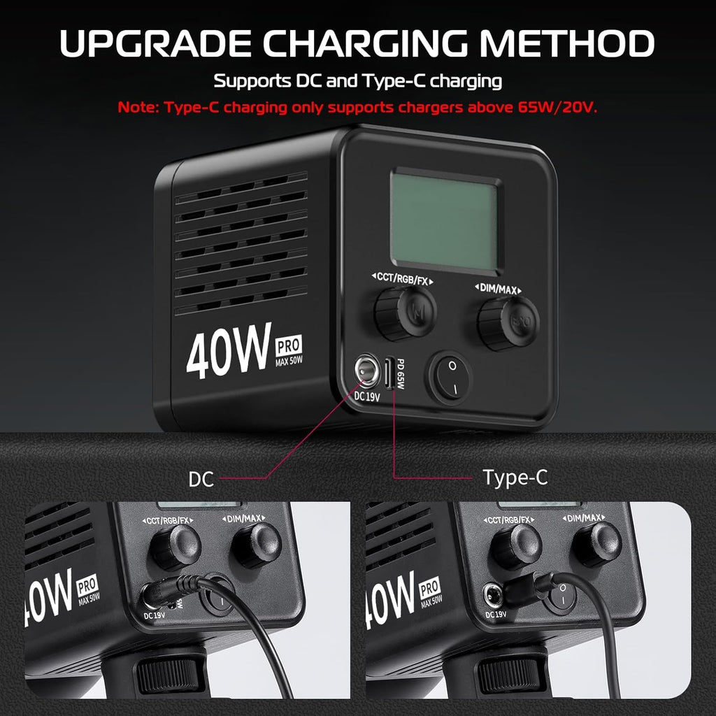 Para cargar y usar la luz simultáneamente vía USB-C, debes usar un cargador o Power Bank con salida PD de 65W / 20V o superior.