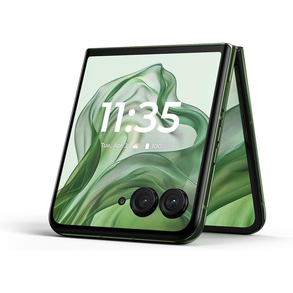 The Motorola Razr+ redefines the mobile experience with its 4.0-inch external display, the largest and smartest in its class. This device allows for hands-free multitasking, including interacting with Shapes powered by Moto AI to capture and create content.